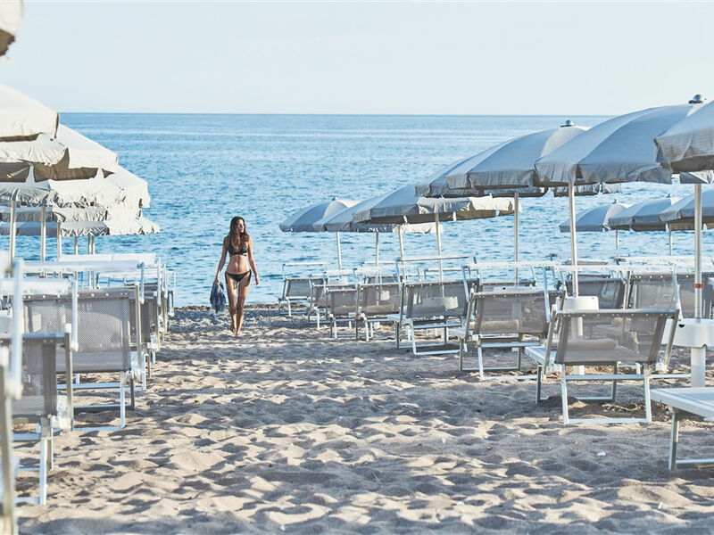 písčito-oblázková, cca 200 m. Část pláže s lehátky, slunečníky, plážovým servisem včetně barové obsluhy na pláži je vyhrazena pouze pro hotelové hosty, lehátka a slunečníky ZDARMA (v omezeném množství). Přístup na pláž po schodech, nadchodem nad magistrálou.