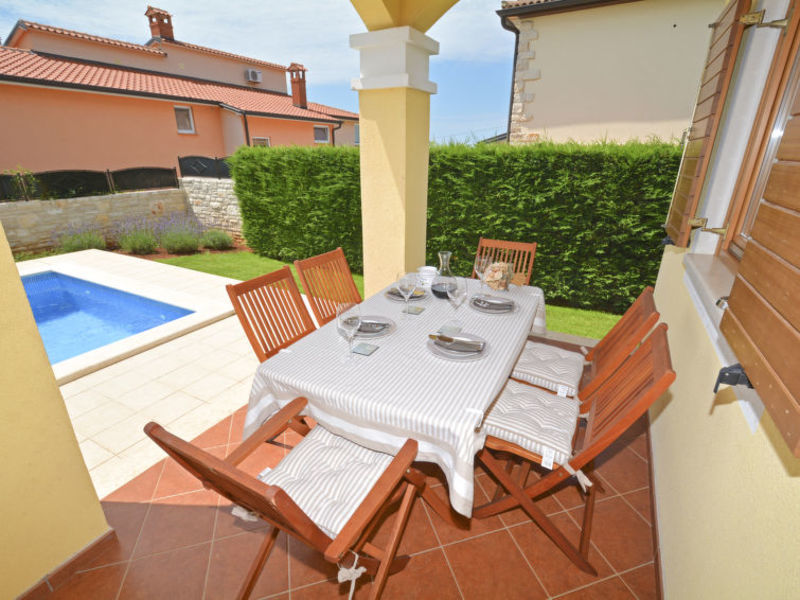 Žbandaj 6 km from Poreč: Beautiful villa "Maras", 2 storeys. In a sunny position, 7 km from the sea. Private: property 500 m2 (fenced), lawn and wildlife garden, swimming pool (7 x 3 m, 23 m2, depth 135 cm, 27.04.-12.10.). Garden furniture. In the house: internet access, washing machine. Parking at the house on the premises. Shop 300 m, supermarket 6 km, restaurant 300 m, pebble beach 7 km, rocky beach 7 km. Tennis 8 km, riding stable 9 km. Nearby attractions: Aquapark 10 km.