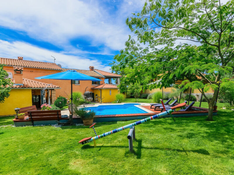 pozemek 1'000 m2 (oplocený), zahrada s trávníkem, bazén (28 m2, 140 cm hluboký, 04. 5. 28. 9. , s vnitřními schůdky. Nepravidelný tvar, venkovní sprcha, dětské hřiště (skluzavka, houpačka).