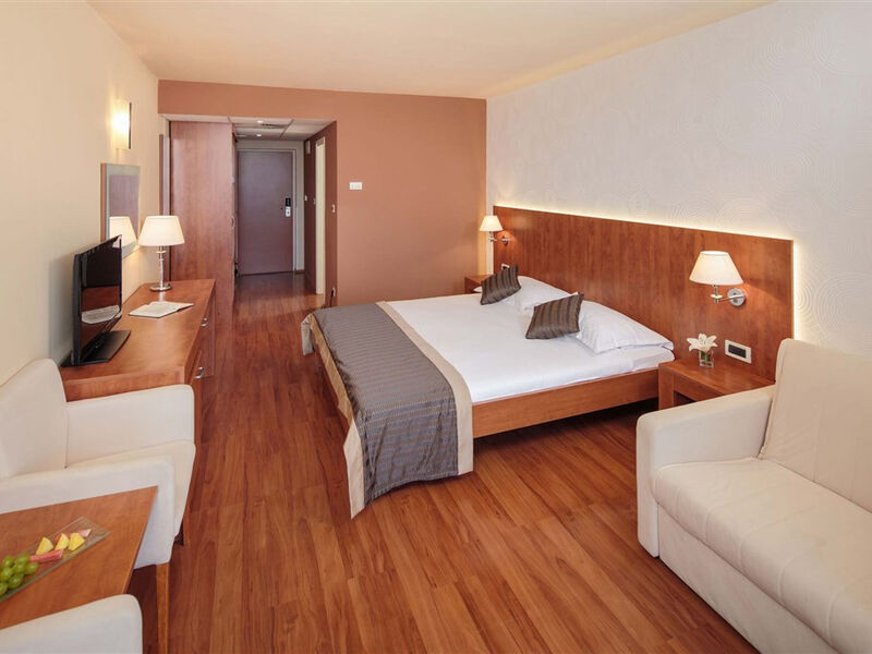 wellness centrum v istrijském stylu Istrian village spa - cca 1600 m2 - vnitřní a venkovní bazén se sladkou vodou, dětský bazén, lehátka a slunečníky u bazénu a na vyhrazené pláži ZDARMA v omezeném množství, ručníky na bazén na kauci, whirlpool, finská, římská, bio sauna, masáže (za poplatek), hřiště pro míčové hry, tenisové kurty, úschovna jízdních kol, půjčovna jízdních kol, vodní sporty, fitness ZDARMA, animační program pro děti a dospělé. Vnitřní bazén uzavřen od poloviny června do poloviny září.Nově otevřený bazénový komplex Punta Pool - tři venkovní bazény - bazén pro plavce s hydromasážní částí a vodopádem, dětský bazén se skluzavkami a vodními atrakcemi, bazén pro nejmenší, lehátka a slunečníky, houpací sítě, dětské hřiště, dětská herna, animace pro děti dle věku (sportovní aktivity, turnaje, tvořivé dílny), animace pro dospělé jóga, pilates, aqua aerobic.