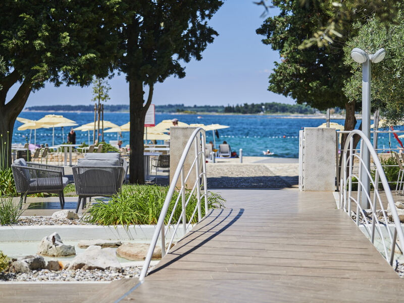 Renovovaný hotel je umístěn v bezprostřední blízkosti pláže, obklopen borovicovým hájem. Cesta do centra Umagu trvá pěšky asi 15 minut.
