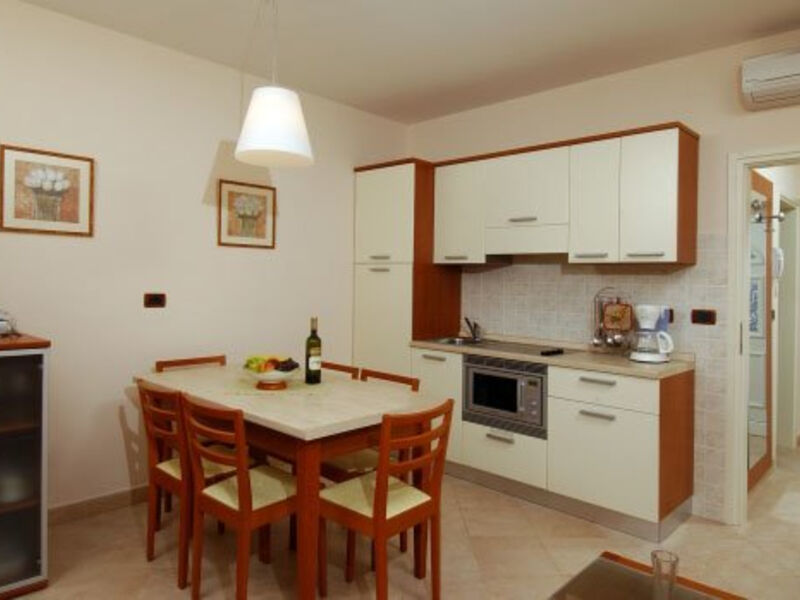 Apartmán pro 6 osob: obývací pokoj s rozkládací pohovkou pro dvě osoby, SAT-TV-LCD a telefonem, kompletně vybavená kuchyň s lednicí, mikrovlnnou troubou a kávovarem, dvě samostatné ložnice po 2 lůžkách, dvě samostatné koupelny / WC se sprchou a fénem. Terasa, která je situována na park nebo na mořskou stranu. Vila je klimatizována.