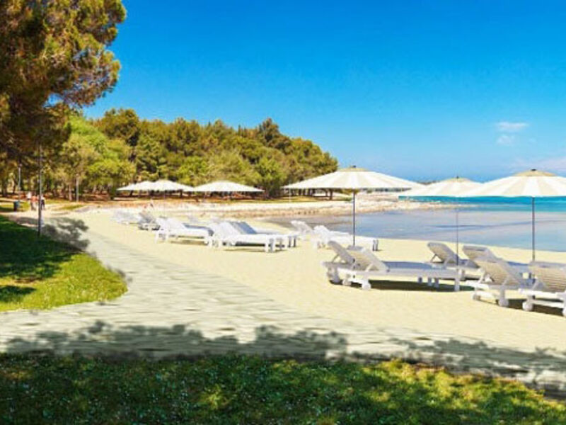 Upravená kamenitá pláž, místy s drobnými kamínky, navezeným pískem nebo vstupy po žebříku je vzdálena cca 300 m od vily.