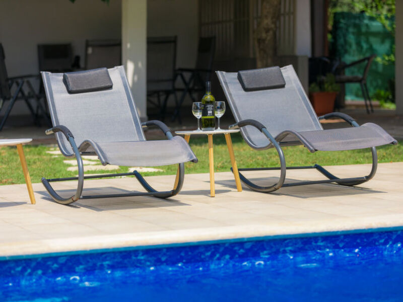 pozemek 1'200 m2 (oplocený), pěkná zahrada s trávníkem a rostlinami, bazén, hranatý tvar (10 x 4 m velký, 140 cm hluboký, 27. 4. 12. 0. , s vnitřními schůdky a čištěním pomocí elektrolýzy soli. WC u bazénu, venkovní sprcha, terasa (30 m2), zahradní nábytek, gril.