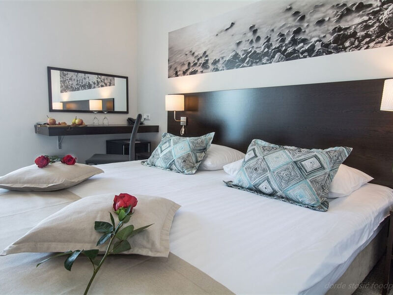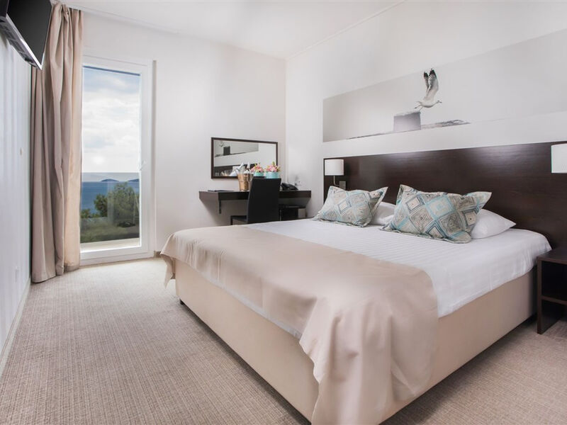 klimatizované 2lůžkové pokoje se sprchou a WC, balkonem, SAT TV, telefonem, minibarem, fénem, sejf, WI-FI, některé s možností přistýlky, pokoje SV s přímým pohledem na moře.