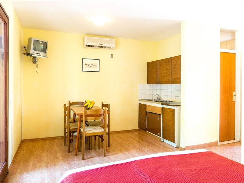 Bungalovy 1/4: malá ložnice se 2 lůžky a obývací místnost s rozkládacím gaučem a kuchyňkou, vlastní příslušenství (koupelna, WC), klimatizace, SAT/TV a terasa.