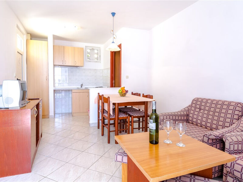 Apartmány ve dvoupodlažních pavilonech mají obývací pokoj se 2 lůžky (rozkládací gauč), kuchyňský a jídelní kout, samostatnou ložnici se 2 lůžky, vlastní příslušenství (koupelna, WC), klimatizaci, SAT/TV a balkon; za poplatek dětská postýlka.