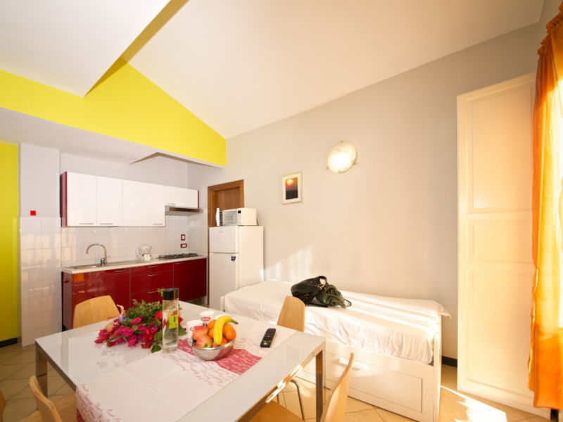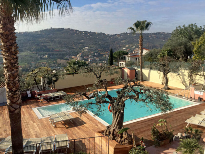 Child friendly holiday development "Villa Giada". 60 apartments in the property. 4 km from the centre of Imperia, in a sunny position on top of a hill, 3 km from the sea, in the countryside. For shared use: property 18'000 m2 with flowers and trees, swimming pool heated (80 m2, depth 20 - 230 cm, 01.04.-30.10.). Children's pool, outdoor shower, tennis, garden furniture, barbecue, children's playground. In the complex: reception, restaurant, bar, breakfast room, WiFi, playroom, storage room for bicycles, laundry (extra), heating available only from 01.11. to 31.03., bicycle rental. Breakfast possible (extra). Parking (extra). Supermarket 1 km, sandy beach 3.5 km pebble beach 2.5 km. Please note: car recommended. Entertainment in the season. Motorway 450 m from the property. The photograph shows a typical example. The residence consists of a 2-storey apartment house and several terraced houses. There is a second swimming pool divided into 2 parts with a total of 90 m2: one part is reserved for children (approx 20 m2, max depth 60 cm), one for adults (approx 60 m2, depth 160 cm). There are also mini football, baskettball (extra) and minigolf. The apartments have balcony or garden. Please note: Wifi available only in the reception area.