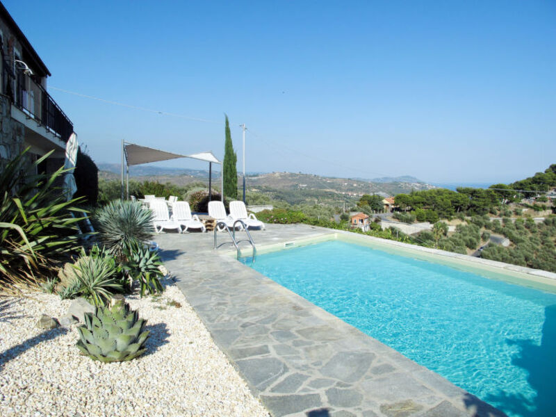 velká, pěkná terasovitá zahrada, 1 ha s trávníkem a rostlinami, ovocná zahrada, bazén (6 x 4 m velký, 150 cm hluboký, 01. 1. 31. 2. . Venkovní sprcha. 300 m dlouhý neupravený, úzký příjezd. Parkovací místo (4 x) na pozemku. Obchod 500 m, supermarket 4 km, železniční stanice "Imperia / Porto Maurizio" 10 km, písečná pláž "San Lorenzo al Mare" 4 km, krytý bazén 10 km.