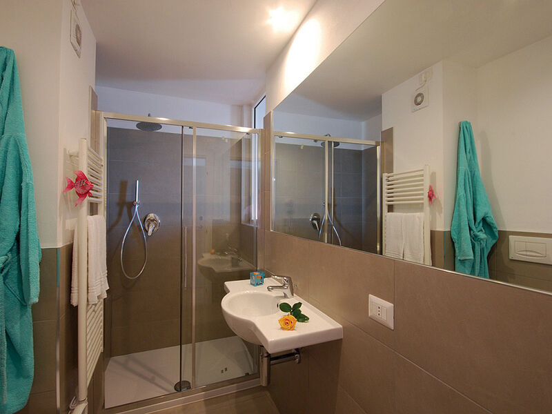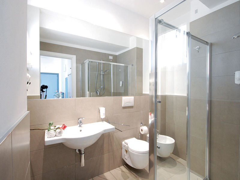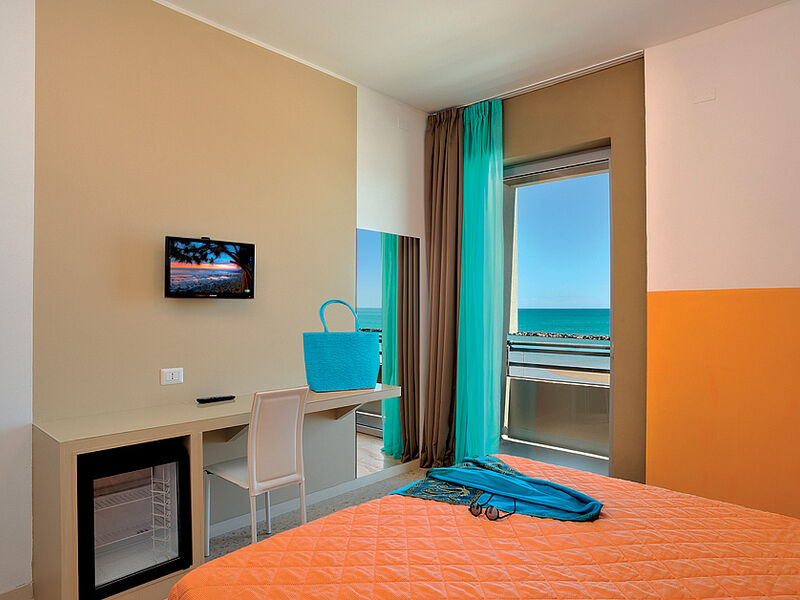 P2/3/4 balkon - pokoj s manželskou postelí či 2 samostatnými lůžky, sociální zařízení se sprchou, balkon; 3. a 4. pevná lůžka; za příplatek lze též objednat nadstandartní pokoj superior či miniapartmán až pro 5 osob (prostornější, s přímým výhledem na moře, klimatizací i nově zařízenými koupelnami)