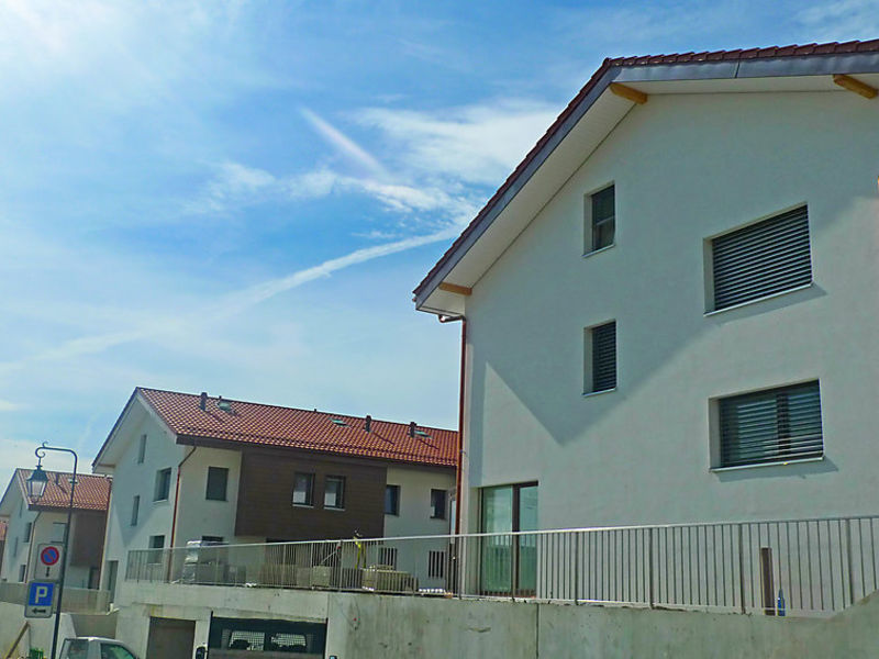 Lussy-sur-Morges 5 km od Morges: Moderní, komfortní řadový dům "Route de Coinsin", obklopen loukami a poli. V obci, v obytné čtvrti, 4 km od jezera, v zeleni. Společné garáže. Obchod 5 km, potraviny 1. km, restaurace 100 m, autobusová zastávka 500 m, železniční stanice "Morges" 5 km, koupaliště 4 km, zátoka ke koupání 4 m. Tenis 4 m, od domu vedou turistické trasy 1 m.